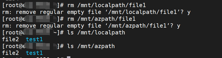rm /mnt/localpath/file1 #輸入y rm /mnt/azpath/file1 #輸入y ls /mnt/localpath ls /mnt/azpath