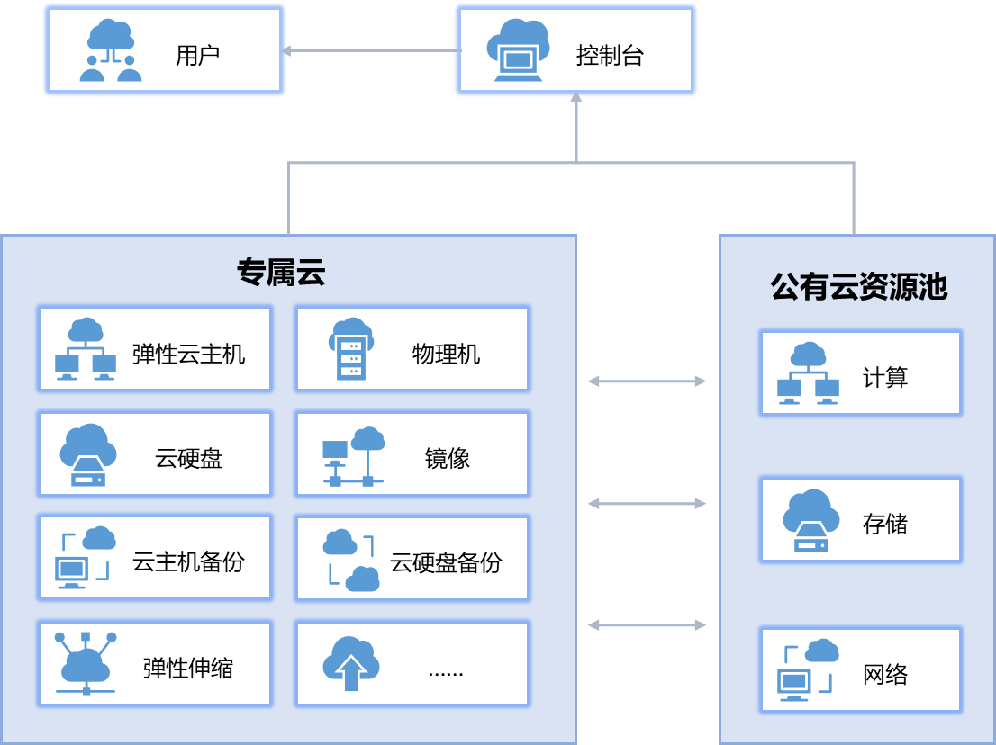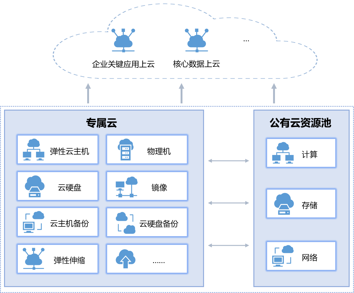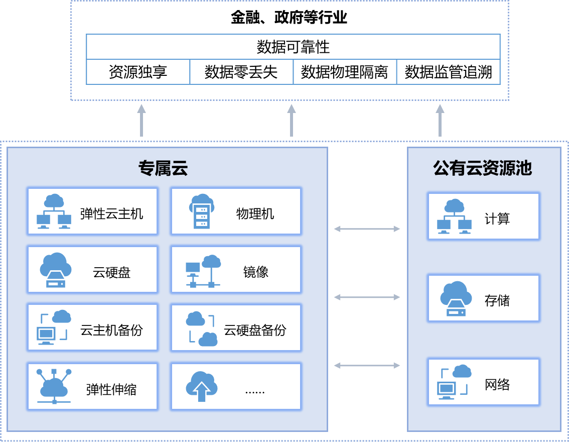 靈活擴展:根據行業特點和業務要求靈活定制所需專屬云資源,也可以按需使用公共資源池資源。