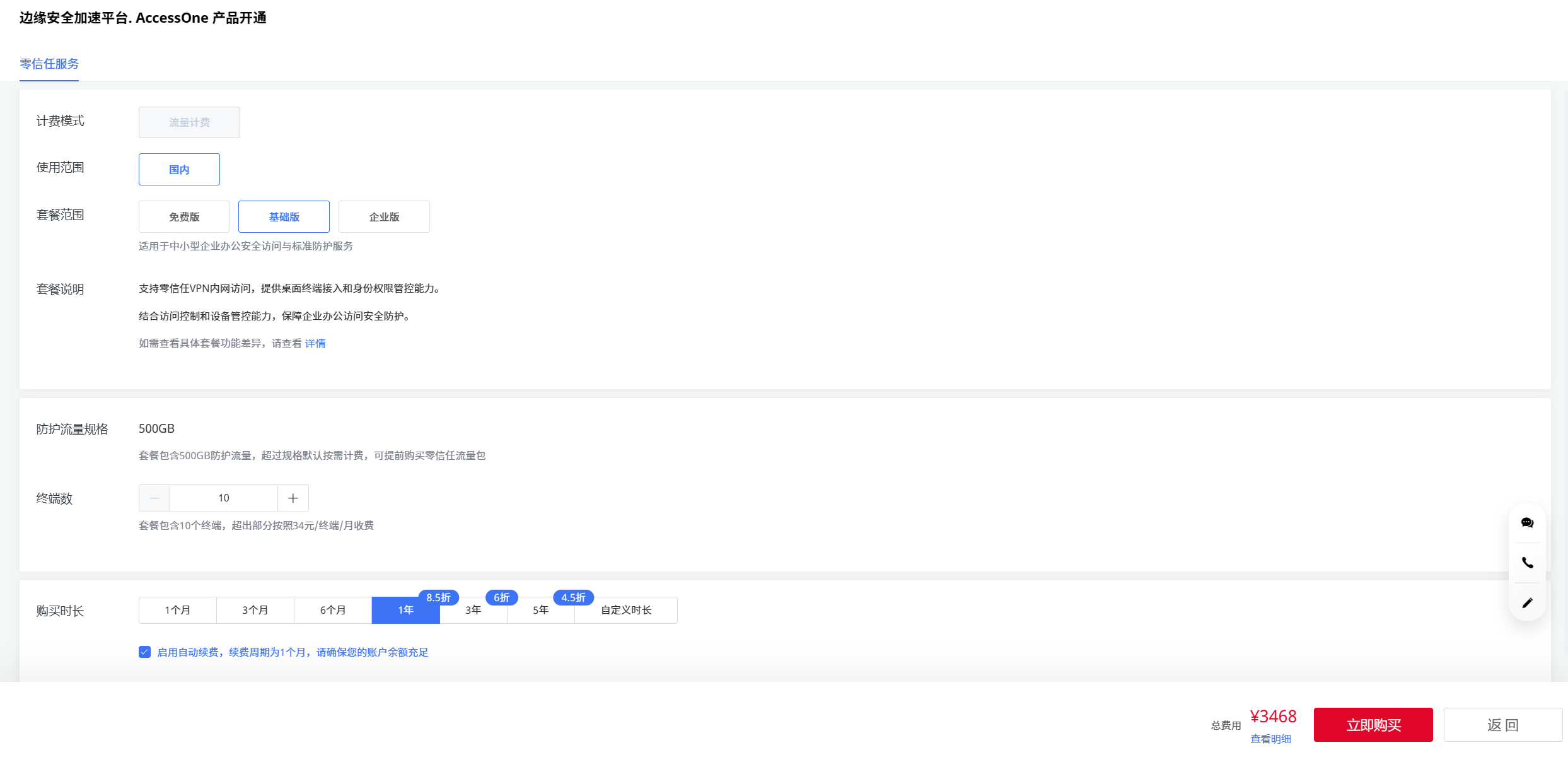 在購買頁面選擇適合的套餐和擴展服務,勾選并閱讀服務協議,確認無誤后點擊【立即購買】,邊緣安全加速平臺—安全與加速服務服務即開通。