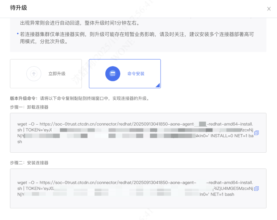 該方(fang)式需要登錄(lu)連接器所在進行(xing)進行(xing)命令升(sheng)級(ji),操作較麻煩但整體(ti)穩(wen)定(ding)性更高(gao),因(yin)為此次(ci)命令安裝方(fang)式是通過卸載(zai)舊版本,升(sheng)級(ji)新版本進行(xing)安裝,組件更純粹(cui),有(you)條(tiao)件登錄(lu)機器的客戶,更推(tui)薦使(shi)用該方(fang)式進行(xing)升(sheng)級(ji)。
