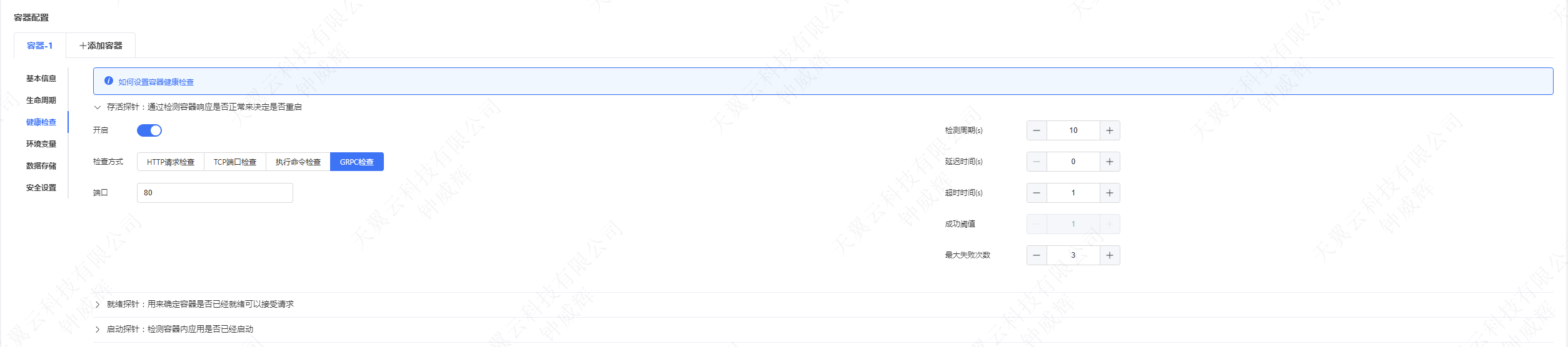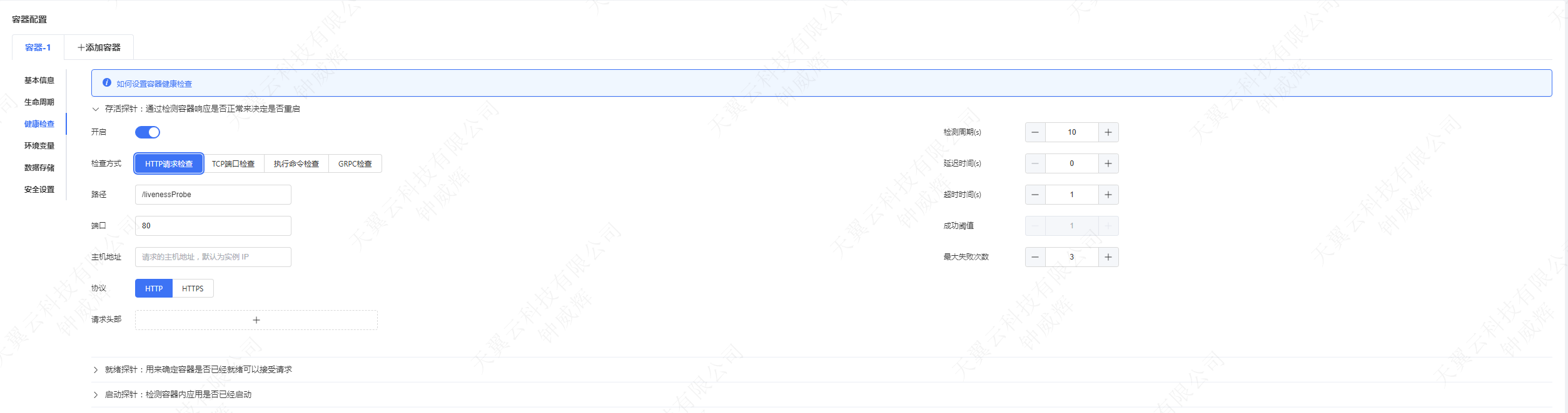 延遲時間(initialDelaySeconds):容器啟動后,開始健康檢查前的等待時間。