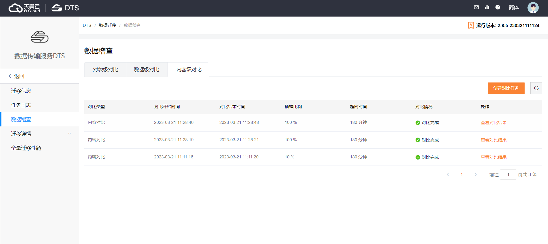 在【數據稽查】頁面中,可分別在對象級對比、數據級對比、內容級對比頁面創建不同級別的對比任務。