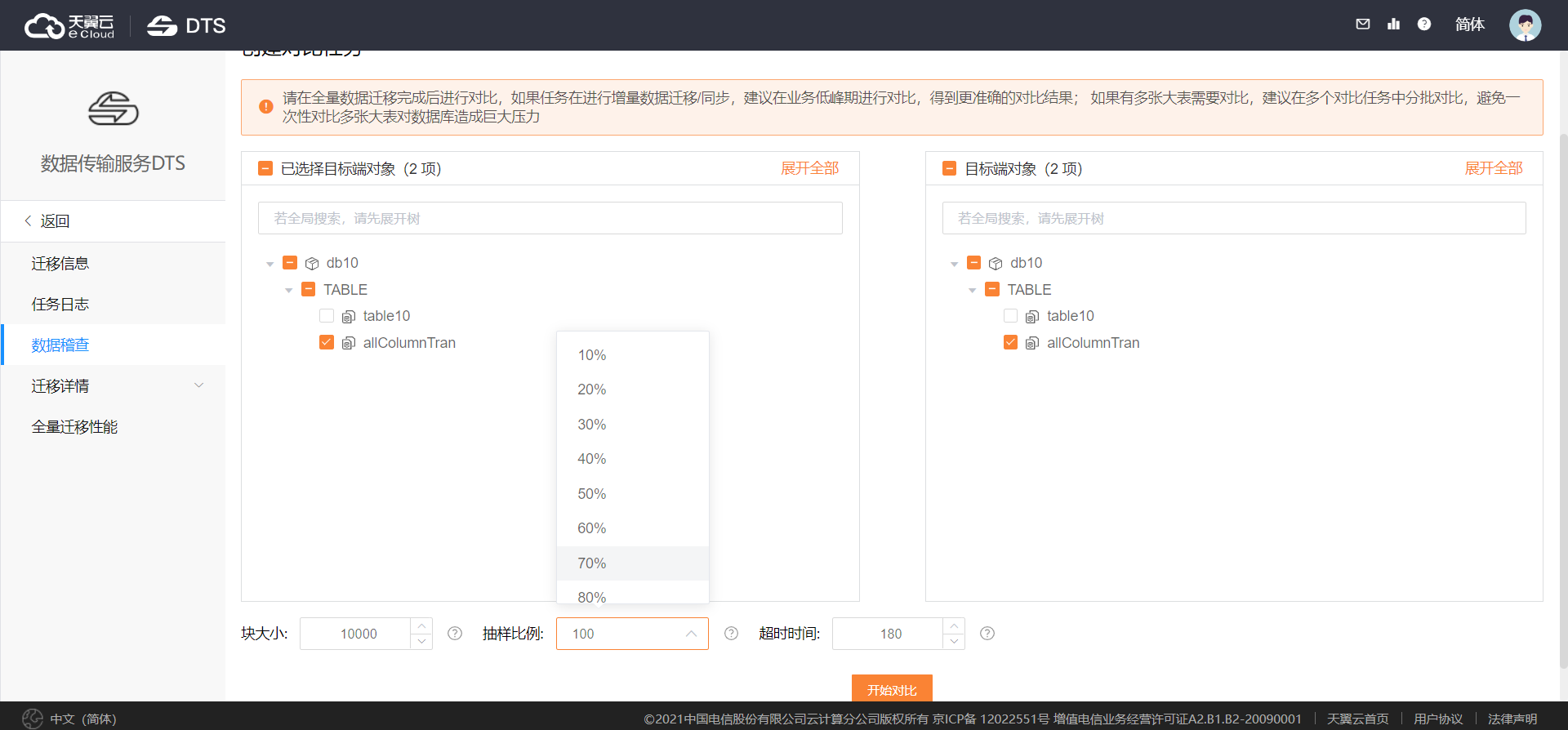 - 支持抽樣校驗:如果遷移或同步的數據量非常大,對所有數據都進行校驗會對源庫和目標庫造成高負荷。為此,內容對比提供抽樣校驗功能,用戶可以通過設置抽樣比例對數據進行抽樣檢驗,以減小數據庫的負擔。可設置的抽樣比例為10%、20%、30%、……、100%。