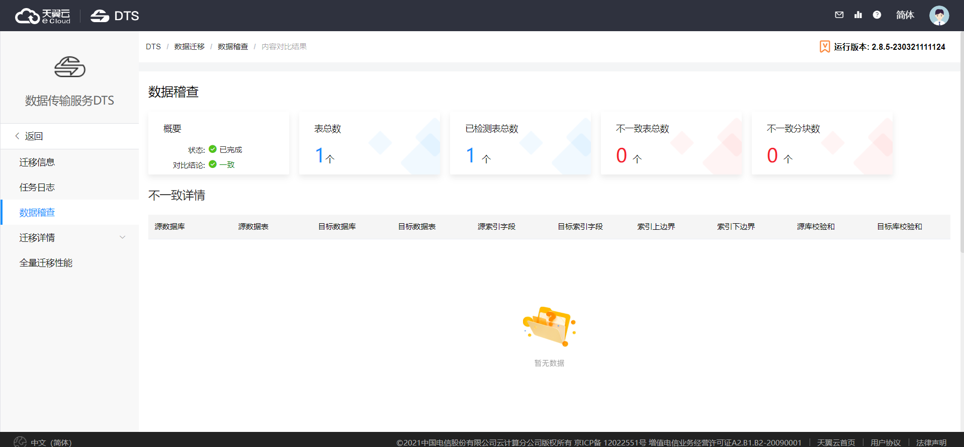 任務運行中或完成后,用戶都可以點擊對比任務進入詳情頁查看對比信息,包括任務狀態、對比結論、對比的表的數量、不一致表數量、不一致的數據塊數量。