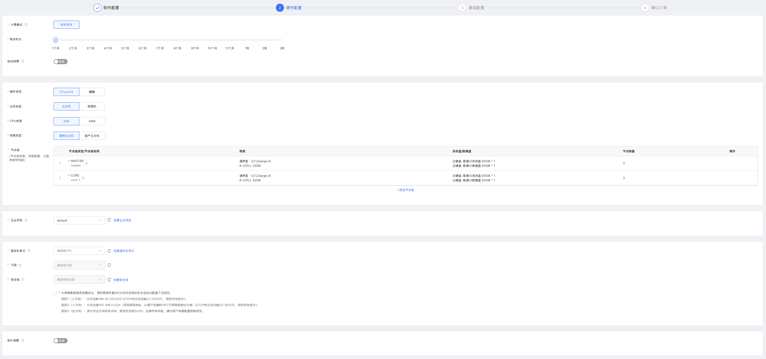 進入“創建集群”頁面進行配置與訂購,軟件配置頁面如下圖所示,參數說明如下: