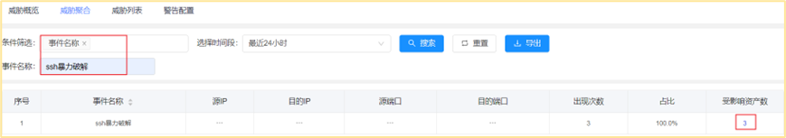 在威脅聚合頁面,用 “事件名稱” 作為聚合條件進行檢索,查找到一條“ssh暴力破解”事件數據,顯示該事件中受影響資產數有3個。