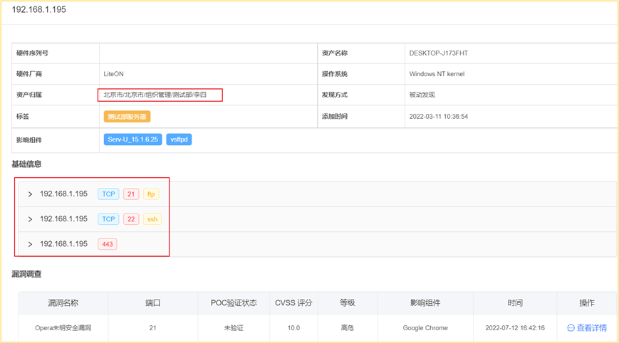 單擊其中一個資產操作列的“查看詳情”,進入資產詳情頁面,查看該資產的詳情和存在漏洞情況。