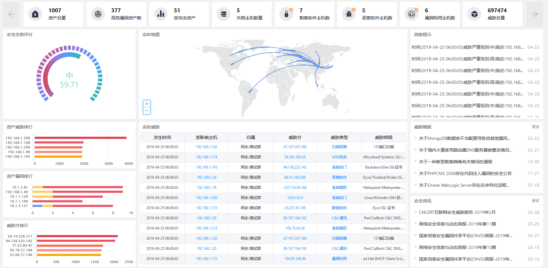 控制臺用來統計分析用戶單位的資產情況、所面臨的威脅情況、單位整體的安全態勢評分、威脅資產、漏洞資產、威脅方、實時消息提示及威脅情報。