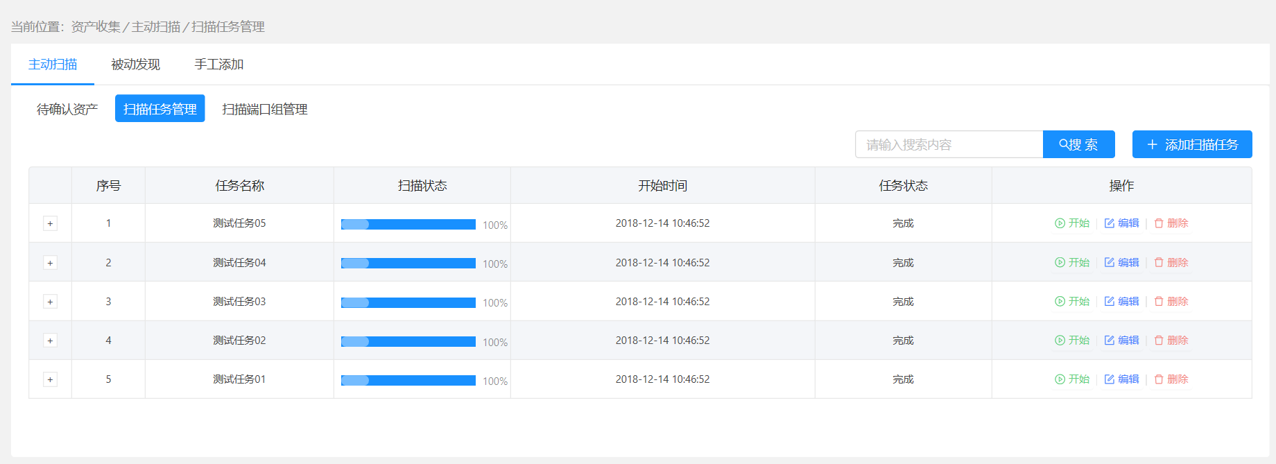 資產掃描任務管理,需在“資產管理 > 資產收集 > 主動掃描 > 掃描任務管理”頁面添加、刪除、編輯、開始、暫停。