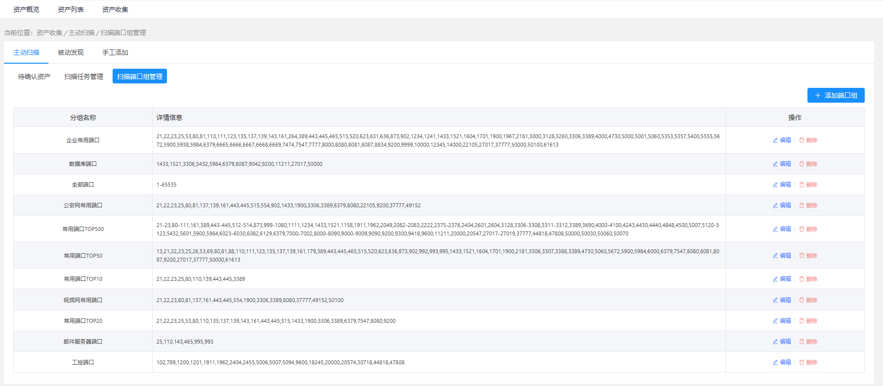 根據不同的網絡環境,系統內置多個掃描的端口組,支持添加、編輯、刪除掃描端口組。