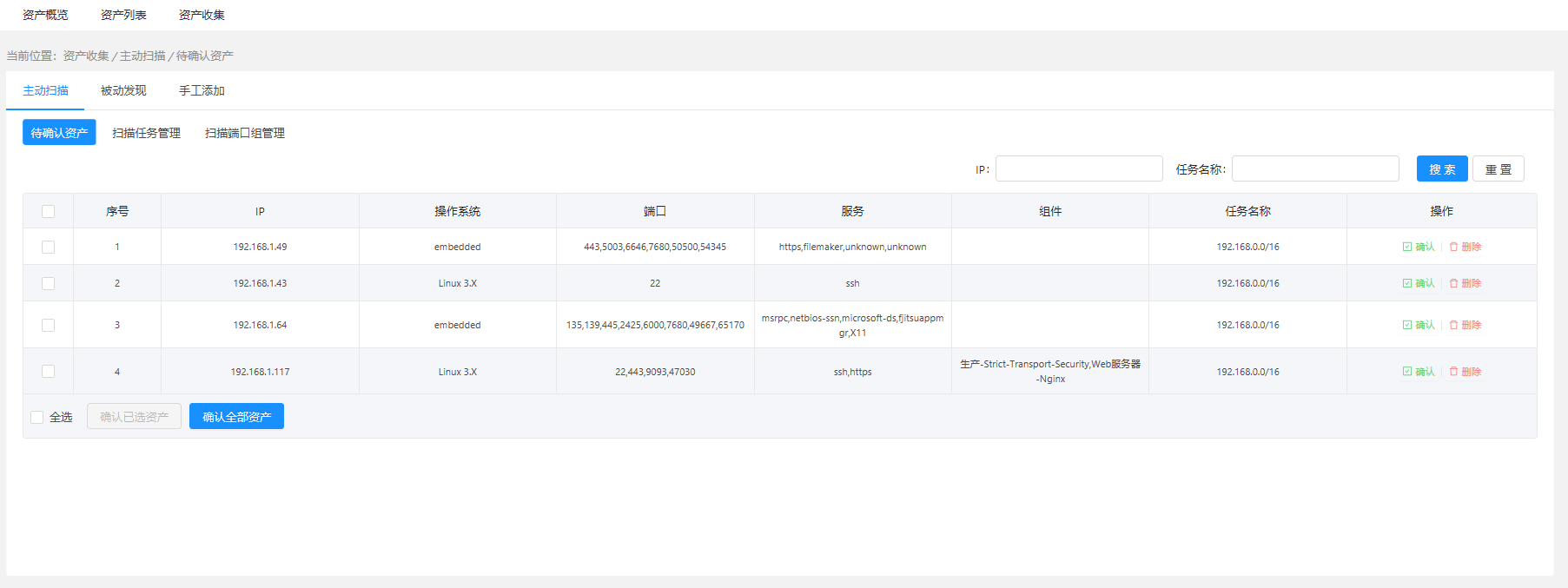 - 如需要人工確認,在被動發現頁面,可以單個或批量確認資產,確認后進入資產列表。