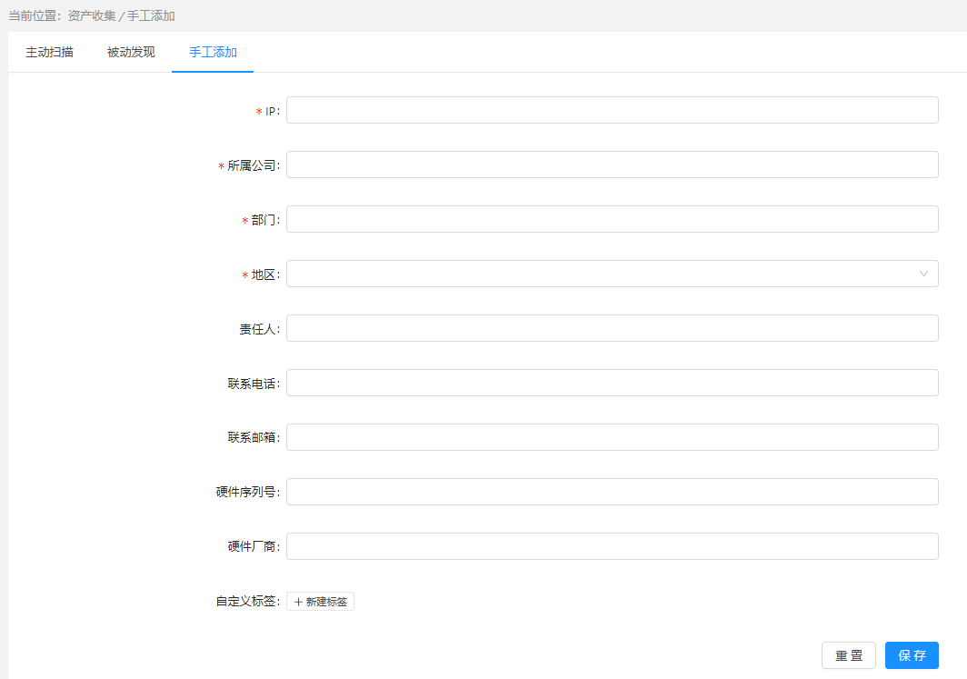 在“資產管理 > 資產收集 > 手工添加”頁面,添加資產IP、歸屬信息、責任人、聯系方式、硬件信息、廠商等信息后點擊“保存”。