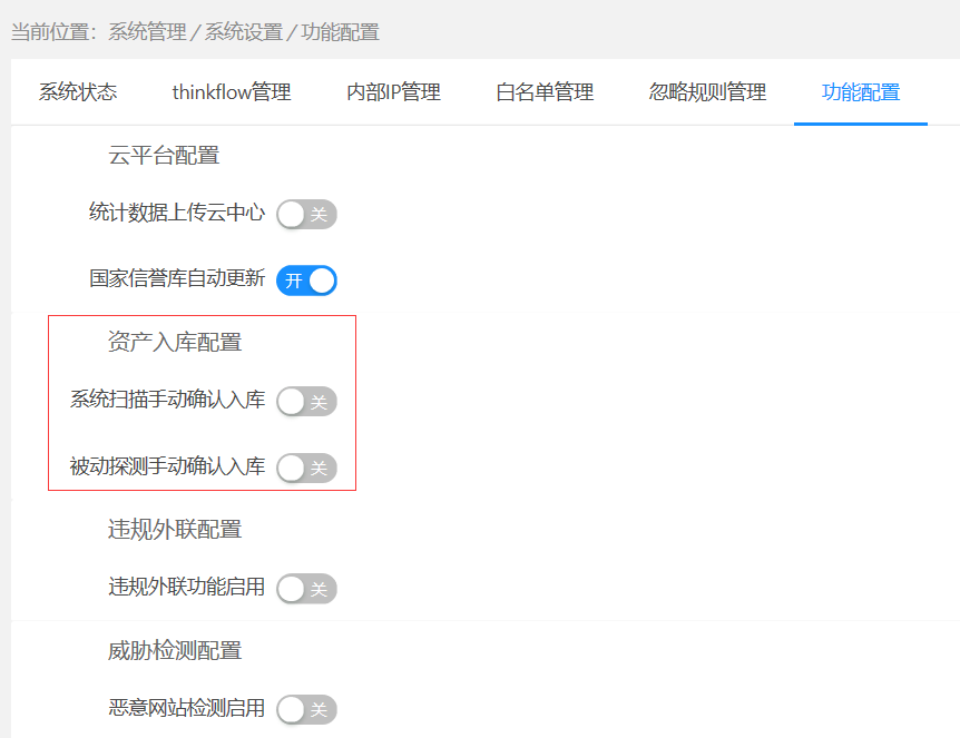 資產入庫配置開關,在“系統管理 > 系統設置 > 功能配置”菜單頁面,默認關閉。