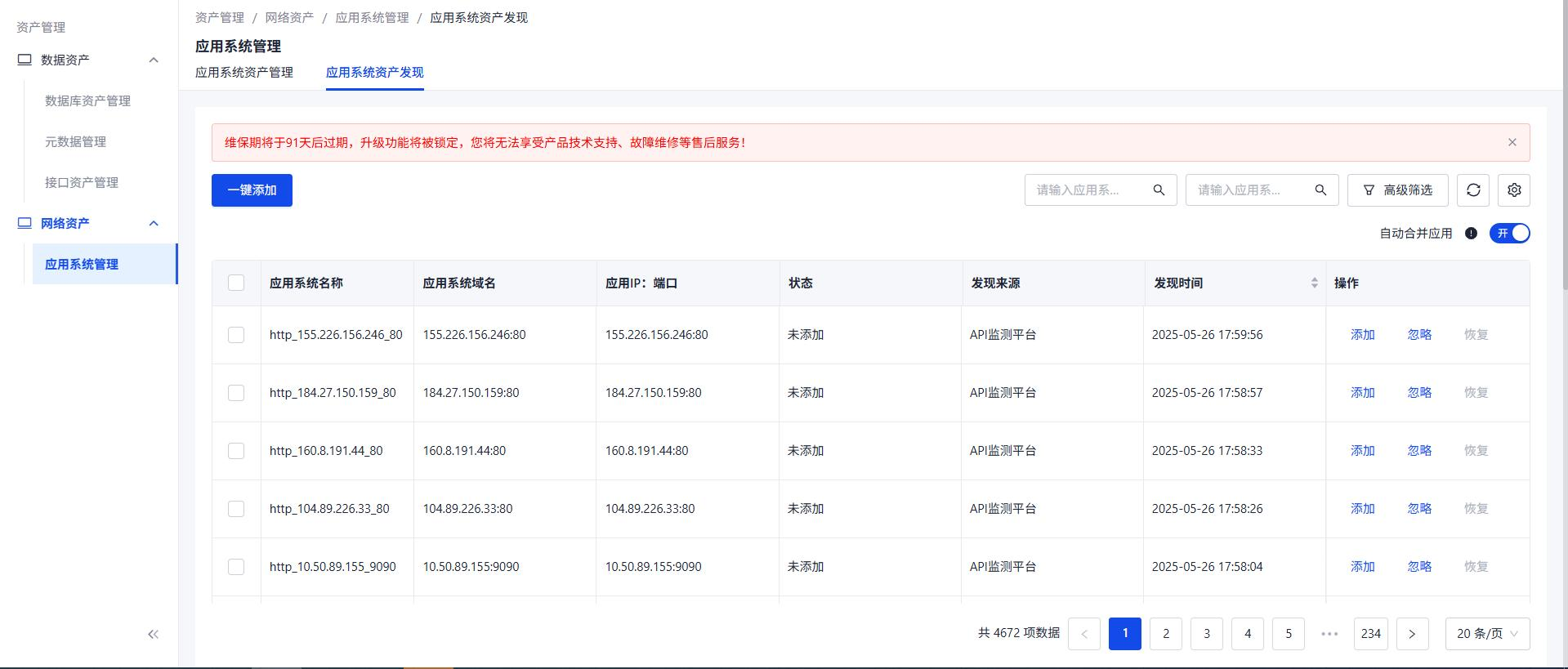 應用系統管理用于根據自動發現、手工錄入、批量導入等方式將用戶的應用系統資產進行統一管理;支持從接口自動發現對應用系統進行一鍵納管。