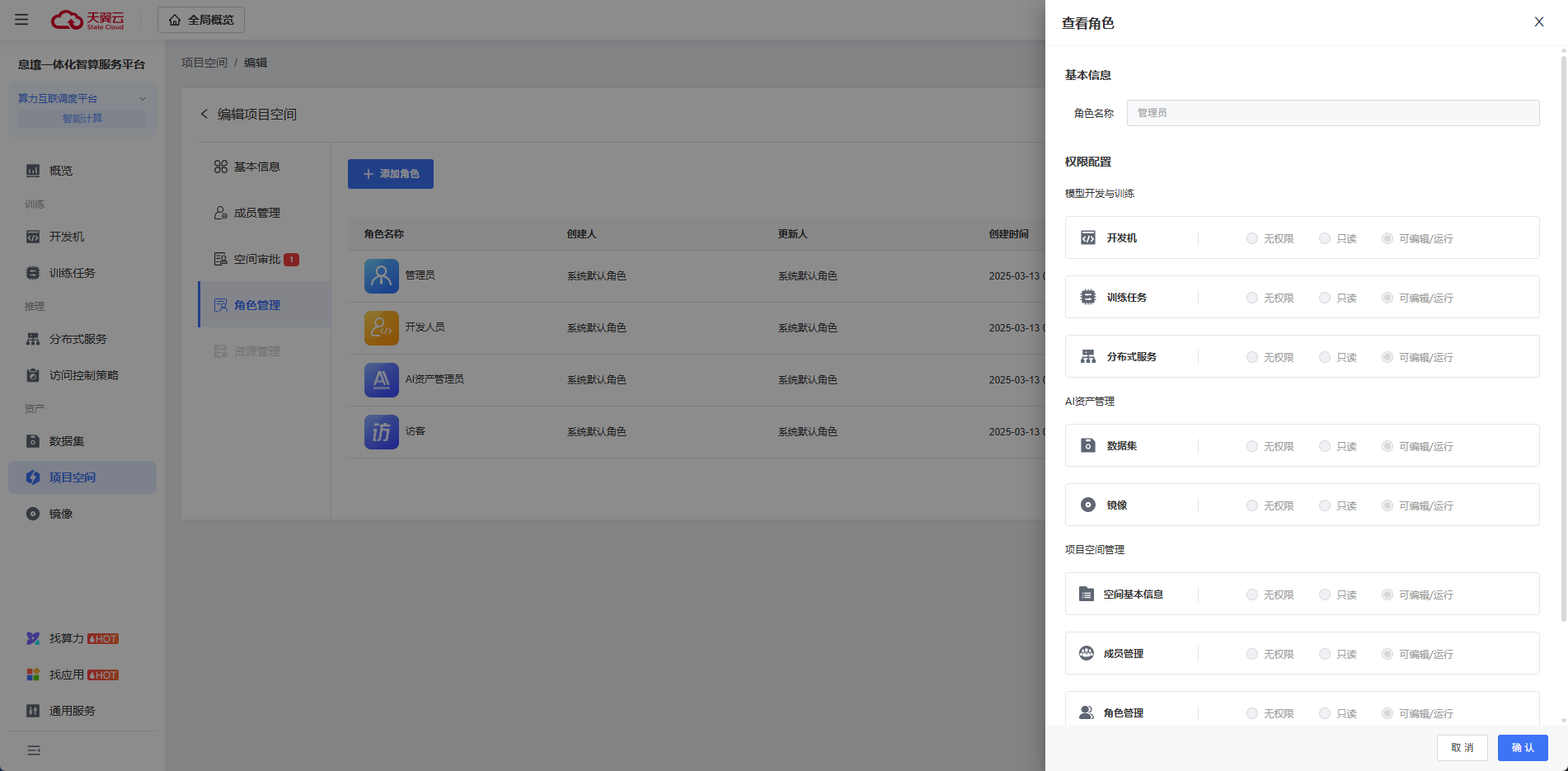 系統默認角色:系統會自動為項目空間創建【管理員】【項目成員】【資產管理員】【訪客】四種默認角色。可以點擊【查看】系統默認角色基本信息和權限信息,系統默認角色不支持編輯和刪除。