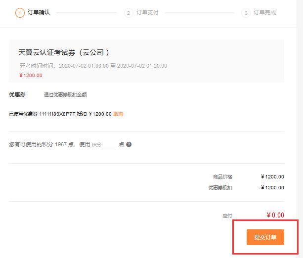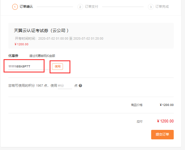 4、進入認證考試付款界面,在“輸入優惠碼位置”輸入優惠券碼,并點擊“使用”