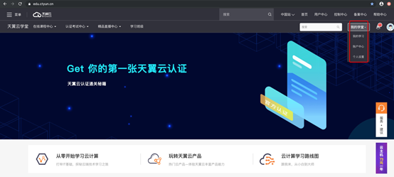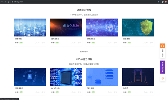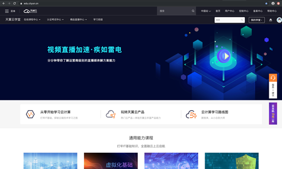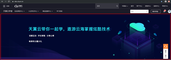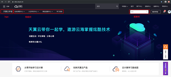 登錄平臺之后會自動進入天翼云學堂首頁,平臺首頁按功能模塊分為11個區域,效果圖如下: