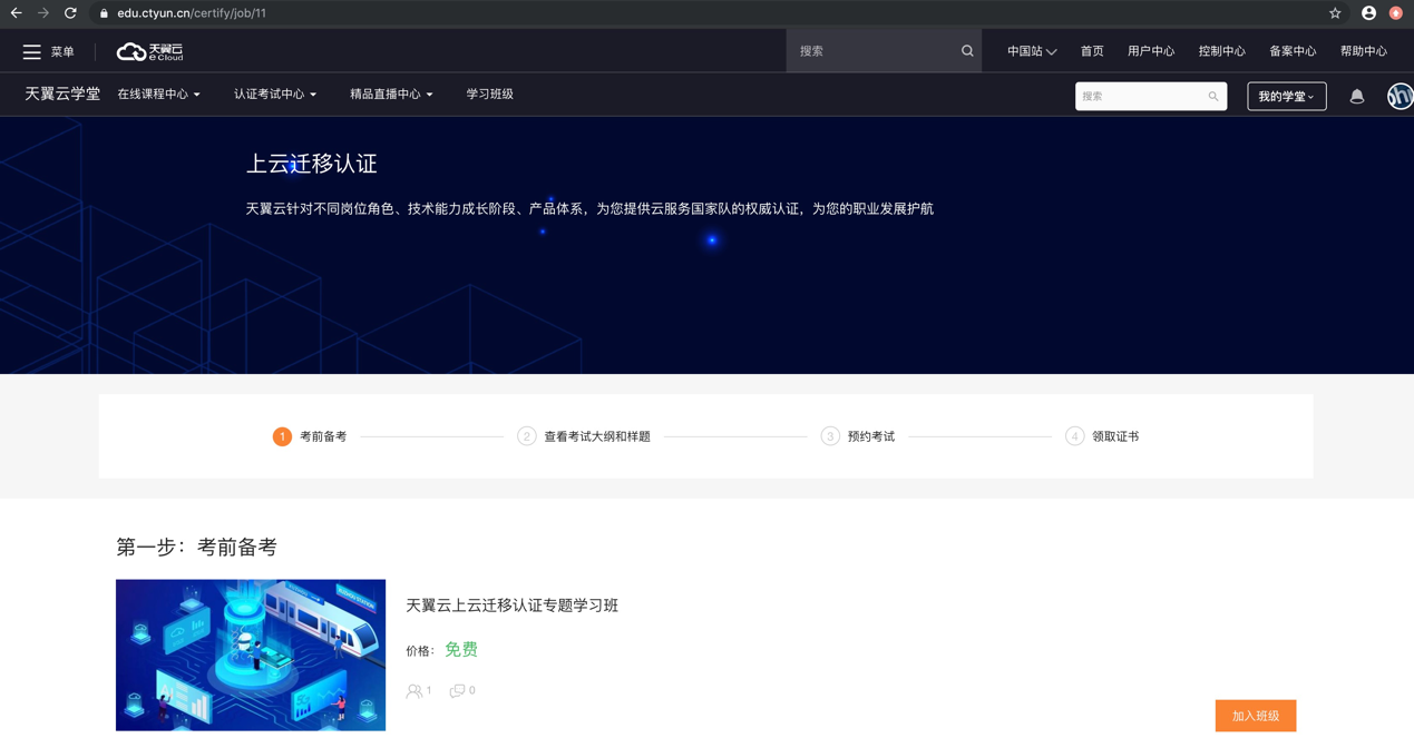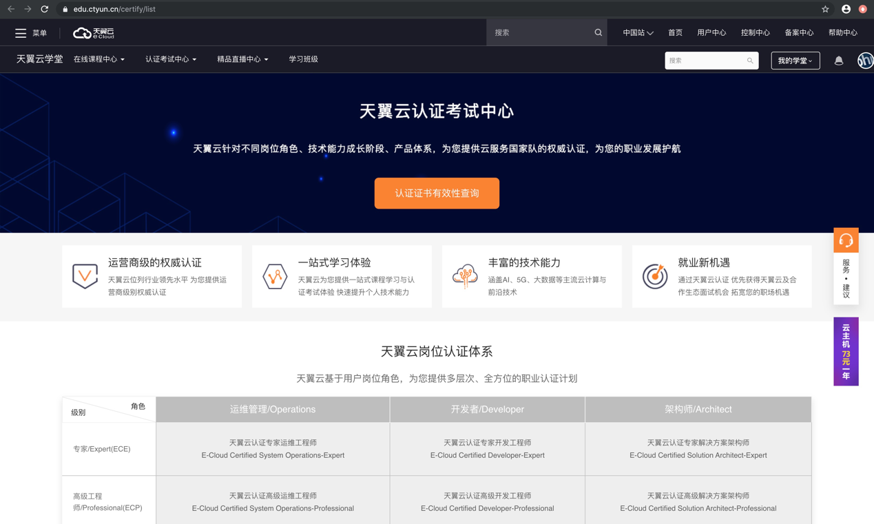 在首頁的導航欄和“職業資格認證”推薦板塊點擊后進入認證考試中心頁面,天翼云學堂所有已上線的認證考試都按照不同的分類用表格的形式展示出來,如下圖所示,其中認證考試名稱標灰色代表該認證任在籌劃中,其中認證考試名稱標藍色代表該認證即將發布。