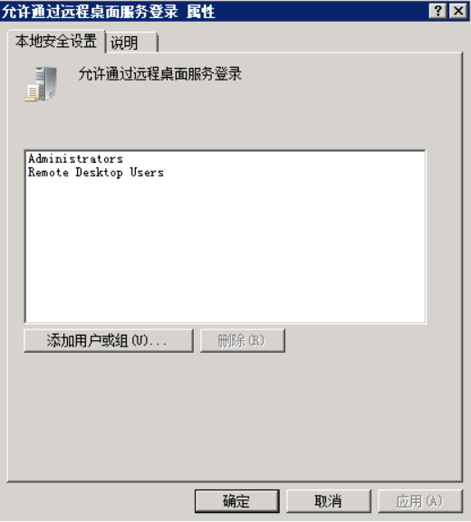 - 確保"組或用戶名"下,包含已經被賦予遠程登錄服務器權限的用戶組或單獨的用戶名。如果缺少上述配置,請用戶點擊“添加”按鈕進行添加。