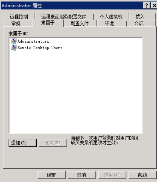 - 在彈出的用戶屬性對話框中,切換到“隸屬于”選項卡,確保用戶隸屬于上述步驟2.2已經被賦予遠程登錄服務器權限的用戶組。