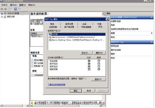- 雙擊默認的遠程桌面連接配置"RDP-Tcp",或其它用戶自己新增的連接配置,然后切換到“安全”選項卡。
