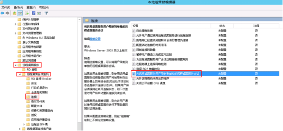 - 打開“計算機配置 > 管理模板 > Windows組件 > 遠程桌面服務 > 遠程桌面會話主機 > 連接”。