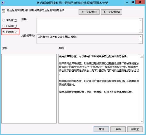 - 雙擊打開“將遠程桌面服務用戶限制到單獨的遠程桌面服務會話”,修改配置為“已禁用”,單擊“確定”保存。
