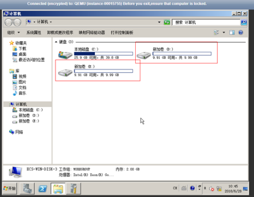 以使用Windows 2008鏡像的云主機為例,假設變更規格前,云主機掛載有1塊系統盤、2塊數據盤,如下圖所示。