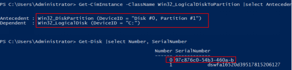 - 執行以下命令查看SerialNumber對應的磁盤。