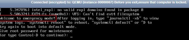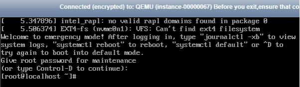 如果故障彈性云主機在/etc/fstab中設置了NVMe SSD盤的開機自動掛載功能,對于新建彈性云主機,系統盤恢復,但掛載的NVMe SSD盤無文件系統,無法實現開機自動掛載,導致云主機啟動時進入緊急模式,如下圖所示。
