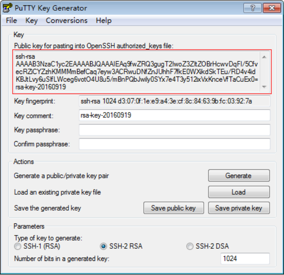 系統將自動加載該私鑰文件,并在“PuTTY Key Generator”中恢復格式正確的公鑰文件內容,如下圖所示,紅框中的內容即為符合系統要求的公鑰文件。