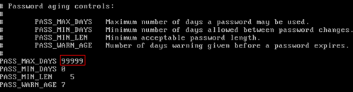 找到配置項“PASS_MAX_DAYS”,該參數表示密碼的有效時間。