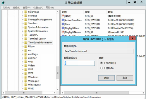 步驟 4 在“TimeZoneInformation”右側區域右鍵單擊,選擇“新建 > DWORD (32-位)值(D)”,添加一項類型為REG_DWORD的機碼,名稱為RealTimeIsUniversal,值設為1。