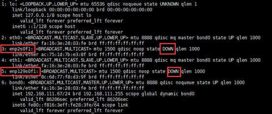 系統默認未使用的以太網卡沒有默認配置文件,在系統啟動時處于down狀態,可以使用ip a命令查看網卡名。例如,一臺Linux操作系統的物理機,eth0/eth1自動組bond0用于VPC網絡;enp2s0f1、enp129s0f1用于自定義VLAN網絡。