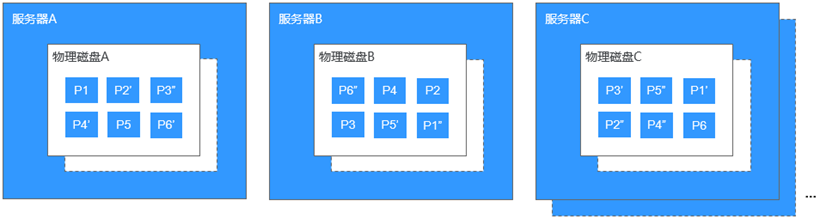 例如,對于服務器A的物理磁盤A上的數據塊P1,系統將它的數據備份為服務器B的物理磁盤B上的P1''和服務器C的物理磁盤C上的P1',P1、P1'和P1''共同構成了同一個數據塊的三個副本。若P1所在的物理磁盤發生故障,則P1'和P1''可以繼續提供存儲服務,確保業務不受影響。