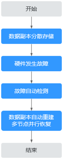 存儲系統的每個物理磁盤上都保存了多個數據塊,這些數據塊的副本按照一定的策略分散存儲在集群中的不同節點上。當存儲系統檢測到硬件(服務器或者物理磁盤)發生故障時,會自動啟動數據修復。由于數據塊的副本分散存儲在不同的節點上,數據修復時,將會在不同的節點上同時啟動數據重建,每個節點上只需重建一小部分數據,多個節點并行工作,有效避免了單個節點重建大量數據所產生的性能瓶頸,將對上層業務的影響做到最小化。
