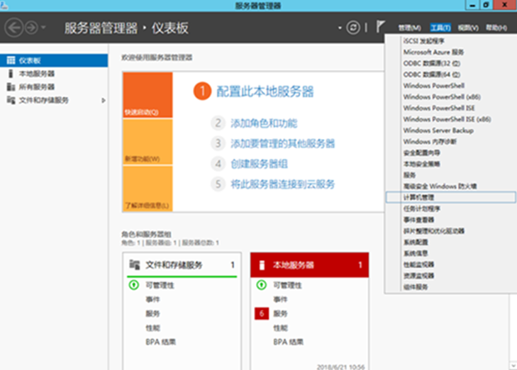 步驟 2 在“服務器管理器”頁面右上方選擇“工具 > 計算機管理”。