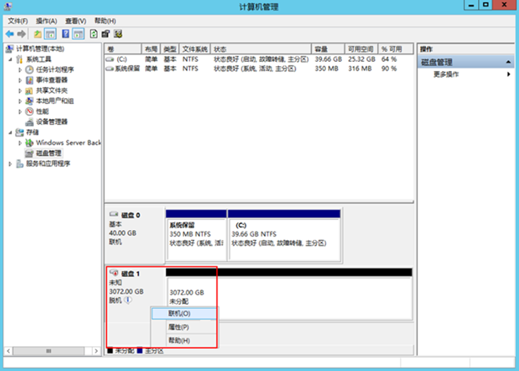 步驟 4 (可選)在頁面右側可以查看磁盤列表,若新增磁盤處于脫機狀態,需要先進行聯機,再進行初始化。