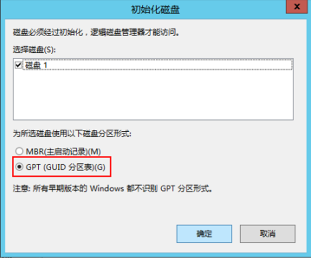 步驟 6 在“初始化磁盤”對話框中顯示需要初始化的磁盤,對于大于2 TB的磁盤,此處請選擇“GPT(GUID分區表)”,單擊“確定”。