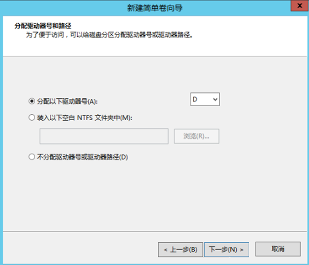 步驟 10 分配到驅動器號和路徑,系統默認為磁盤分配驅動器號,驅動器號默認為“D”,此處以保持系統默認配置為例,單擊“下一步”。