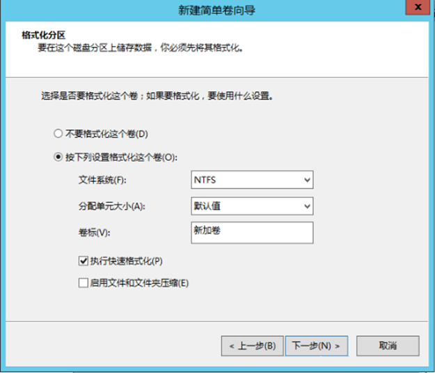 步驟 11 格式化分區,系統默認的文件系統為NTFS,并根據實際情況設置其他參數,此處以保持系統默認設置為例,單擊“下一步”。