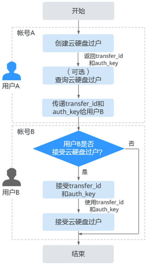 以將帳號A的云硬盤過戶給帳號B為例。用戶A屬于帳號A,用戶B屬于帳號B。由用戶A創建過戶記錄,用戶B通過云硬盤過戶記錄ID(transfer_id)和云硬盤過戶的身份認證密鑰(auth_key)接受過戶,接受成功后即完成過戶,基本流程如下圖所示。