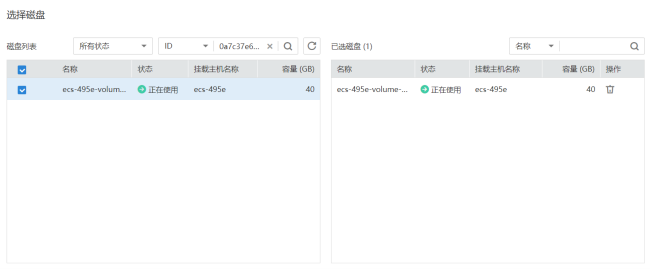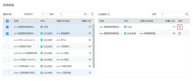步驟 5 在云硬盤列表中勾選需要備份的云硬盤,勾選后將在已勾選云硬盤列表區域展示,如下圖所示。可以單擊已選磁盤操作列的刪除按鈕,對不需要備份的磁盤進行刪除。