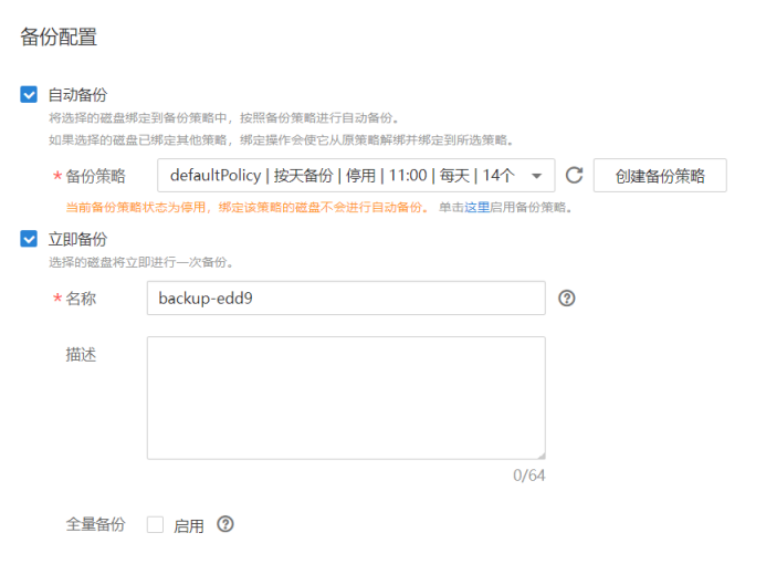 | 名稱 | 只能由中文、英文字母、數字、下劃線、中劃線組成,不能含有特殊字符,不能以auto開頭。如果在云硬盤列表中只選擇了一個磁盤進行備份,名稱長度范圍為1-64字符。如果選擇多個磁盤,名稱長度范圍為1-59字符。 | Backup-edd9 |