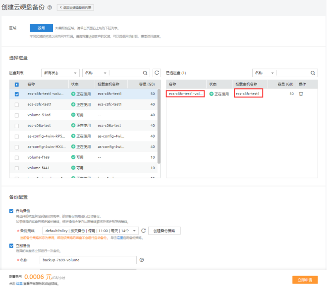 - 磁盤處于“可用”或“正在使用”狀態才可進行備份,如果對磁盤進行了擴容、掛載、卸載或刪除等操作,請刷新界面,確保操作完成,再決定是否要進行備份。