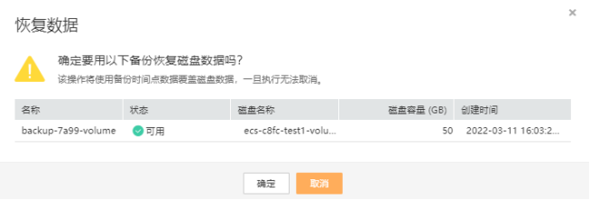 2.在“備份”頁簽下,選中創建成功的備份,單擊操作列“恢復數據”,進入恢復云硬盤的向導頁面,按需選擇對應選項,點擊確定。