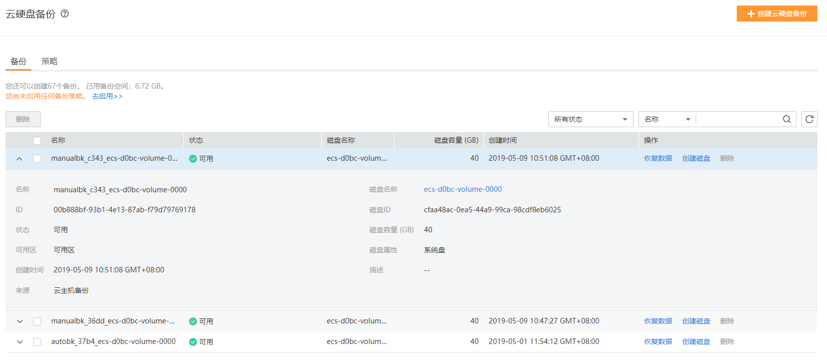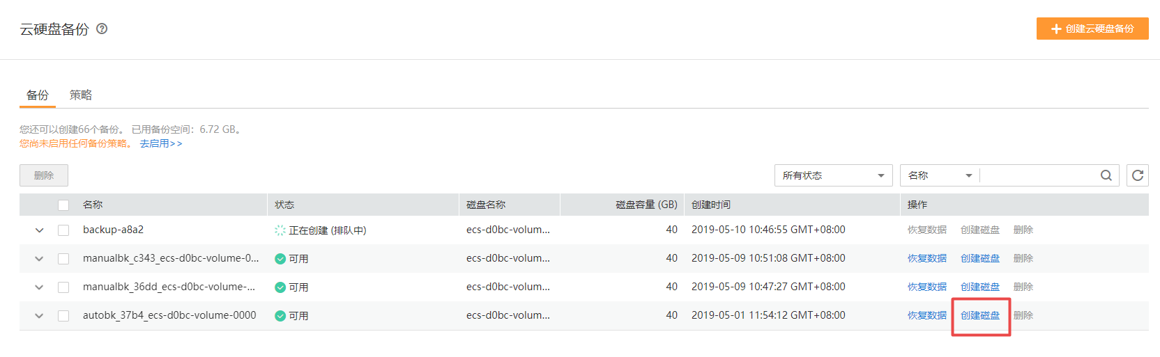 - 單擊備份所在行的“創建磁盤”。