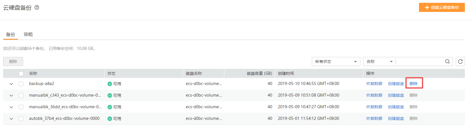 - 單擊備份所在行的“刪除”,或批量勾選需要刪除的備份,單擊左上角的“刪除”。