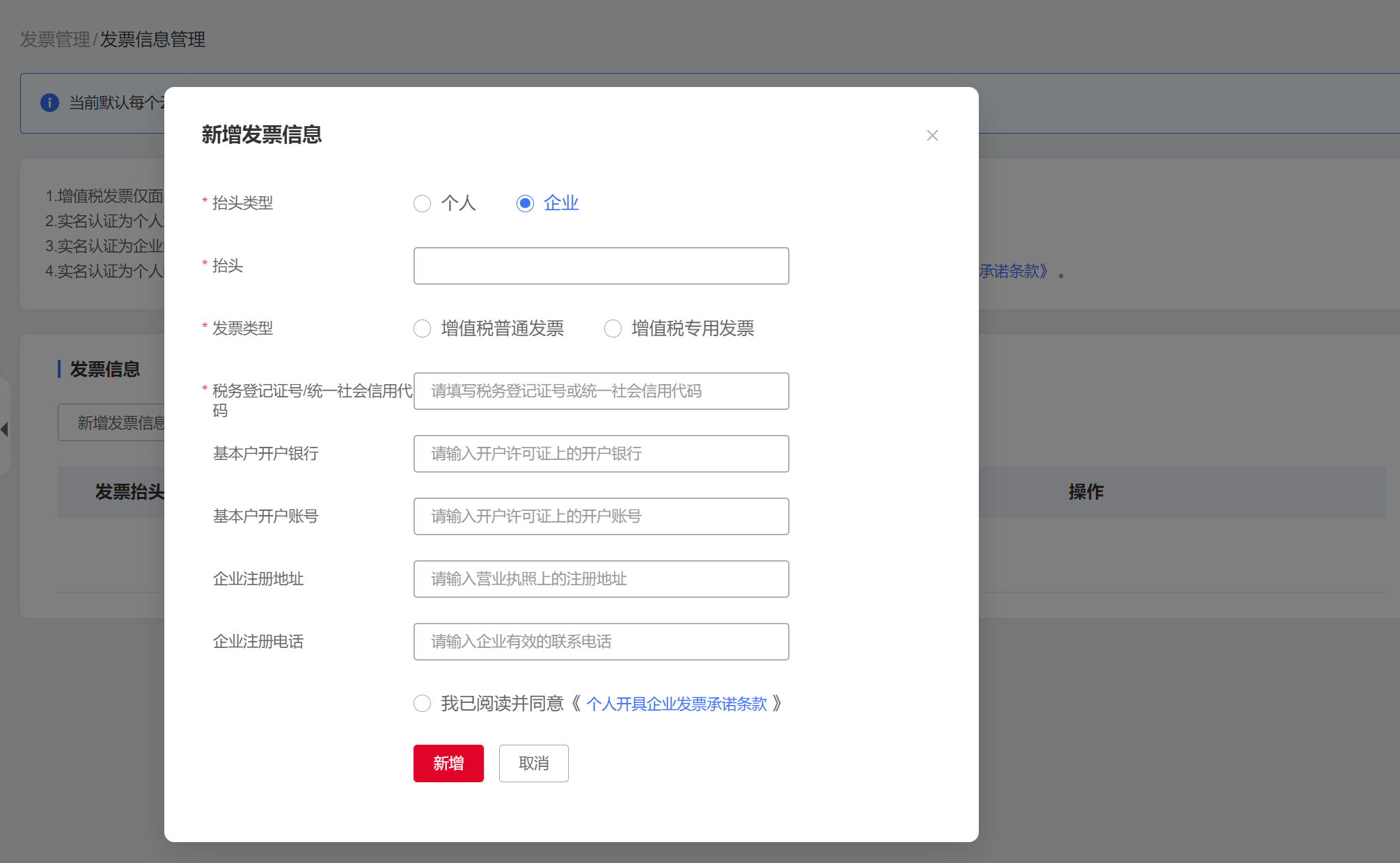 (2)點擊”新增發票信息“,根據需要設置發票信息。
