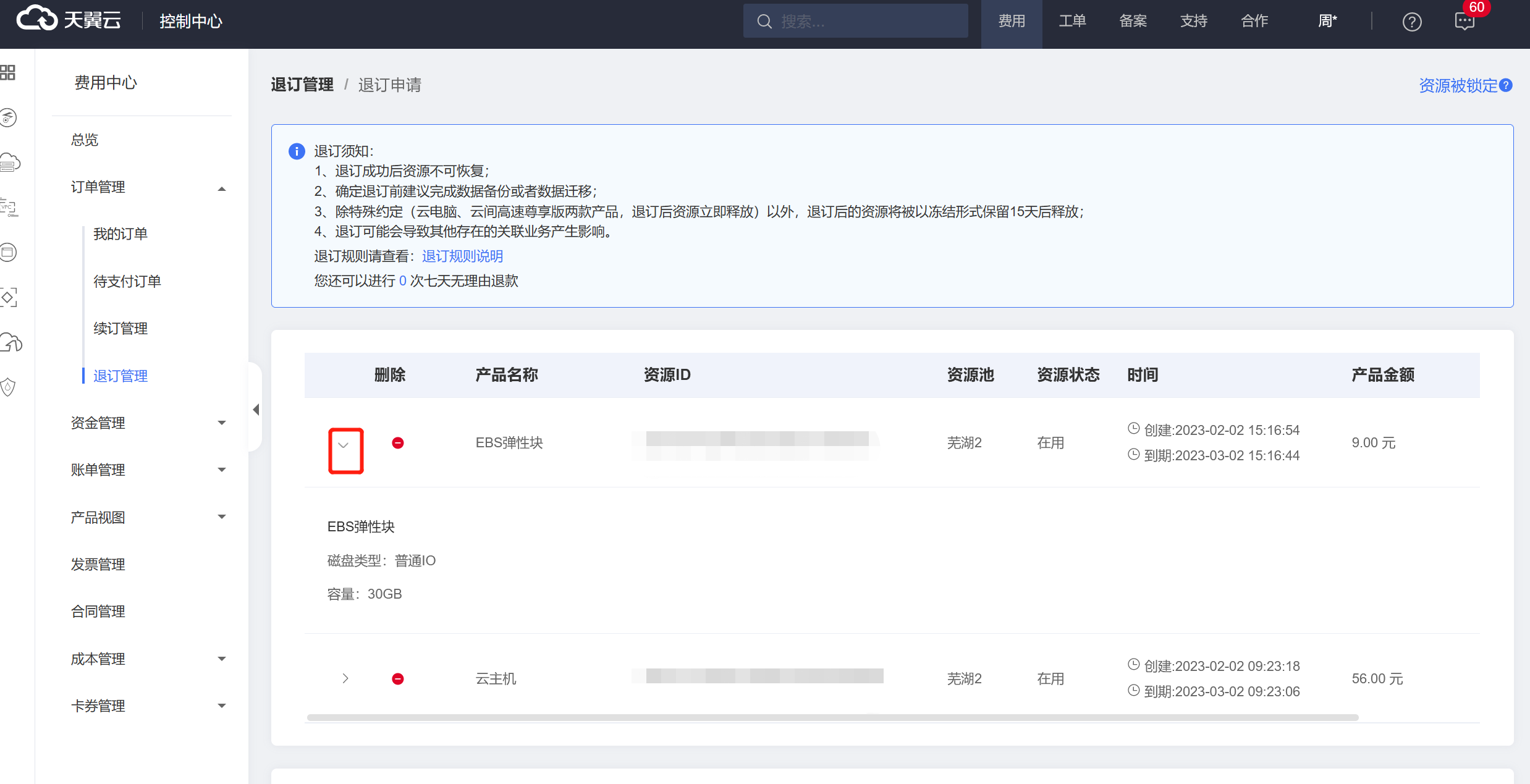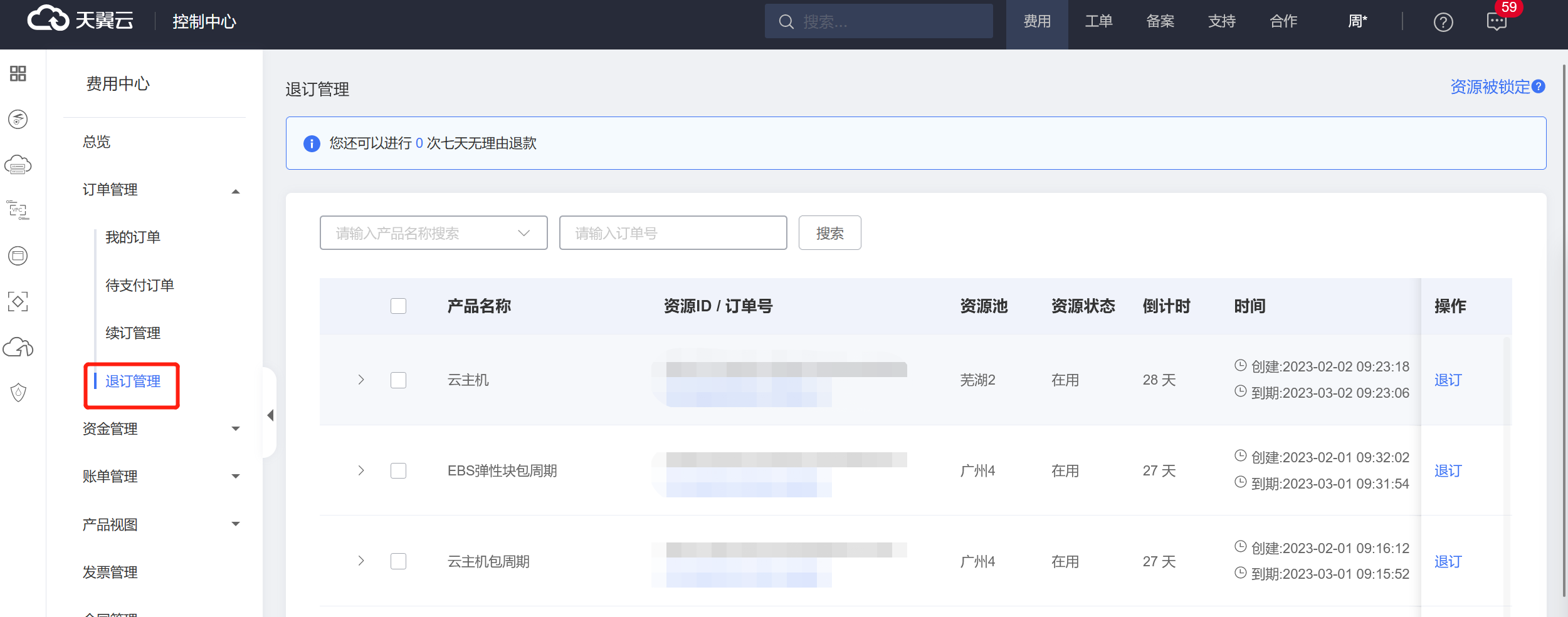 1、登錄天翼云官網,進入“費用中心-訂單管理-退訂管理” 頁面。